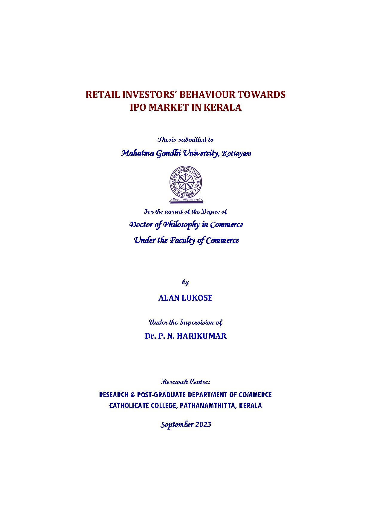 Retail investors' behaviour towards IPO market in Kerala Retail investors' behaviour Studies on Financial Literacy Studies on Personality Traits Studies on Behavioural Finance Studies on Behavioural Bias Studies on Risk Tolerance Studies on IPO Investment Studies on Investment Decision