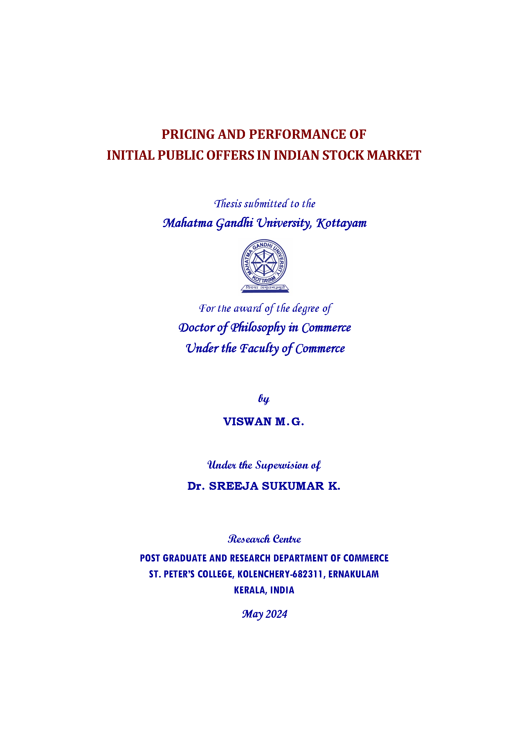 Research Supervisor, St Peter's College, Kolenchery |