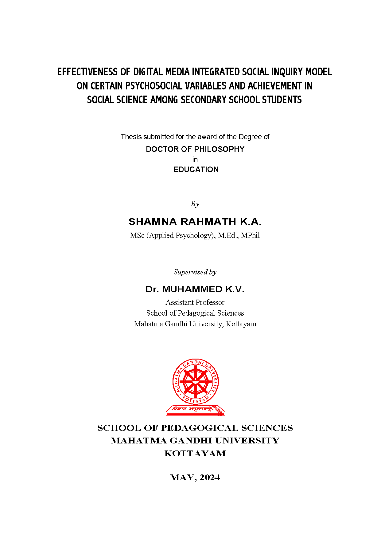 Effectiveness of digital media integrated social inquiry model on certain psychosocial variables and achievement in social science among secondary school students