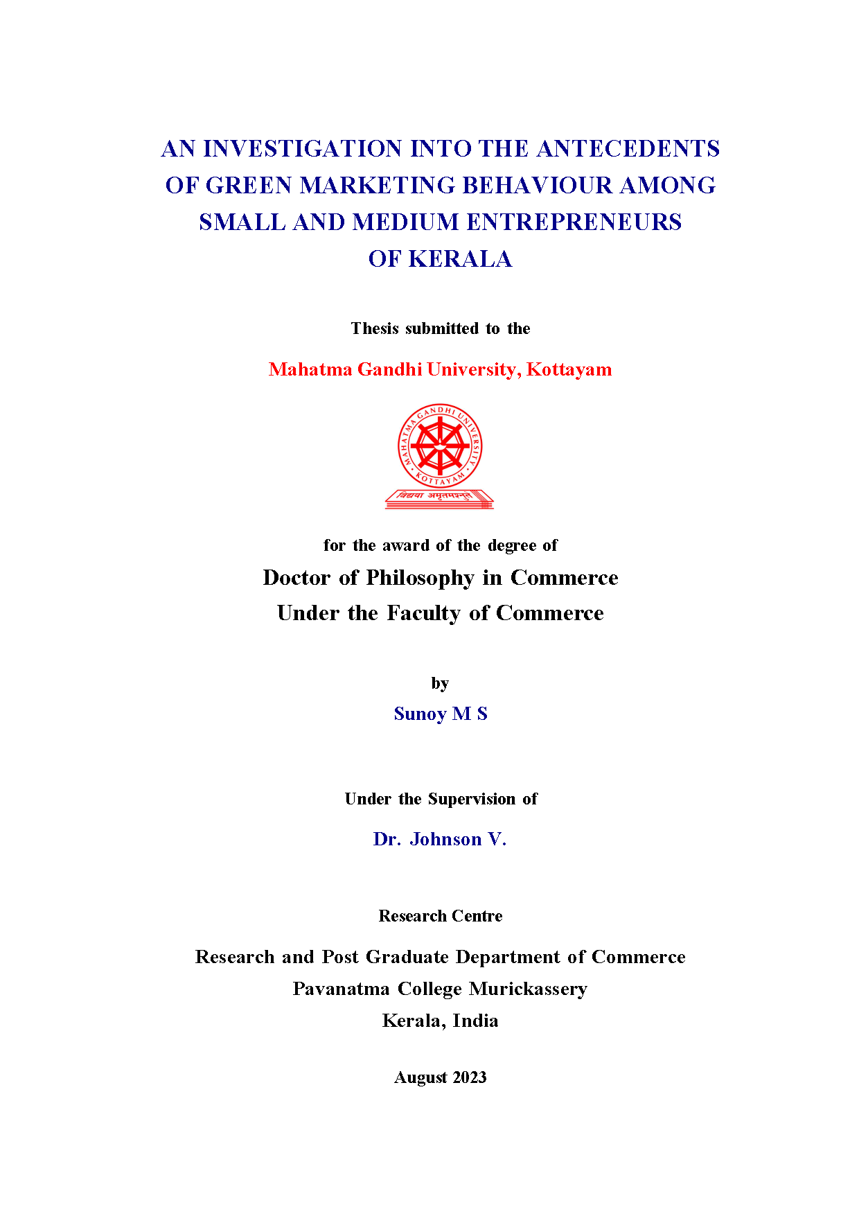 Research Guide, Research and P.G. Department of Commerce, Pavanatma College, Murickassery, Idukki |