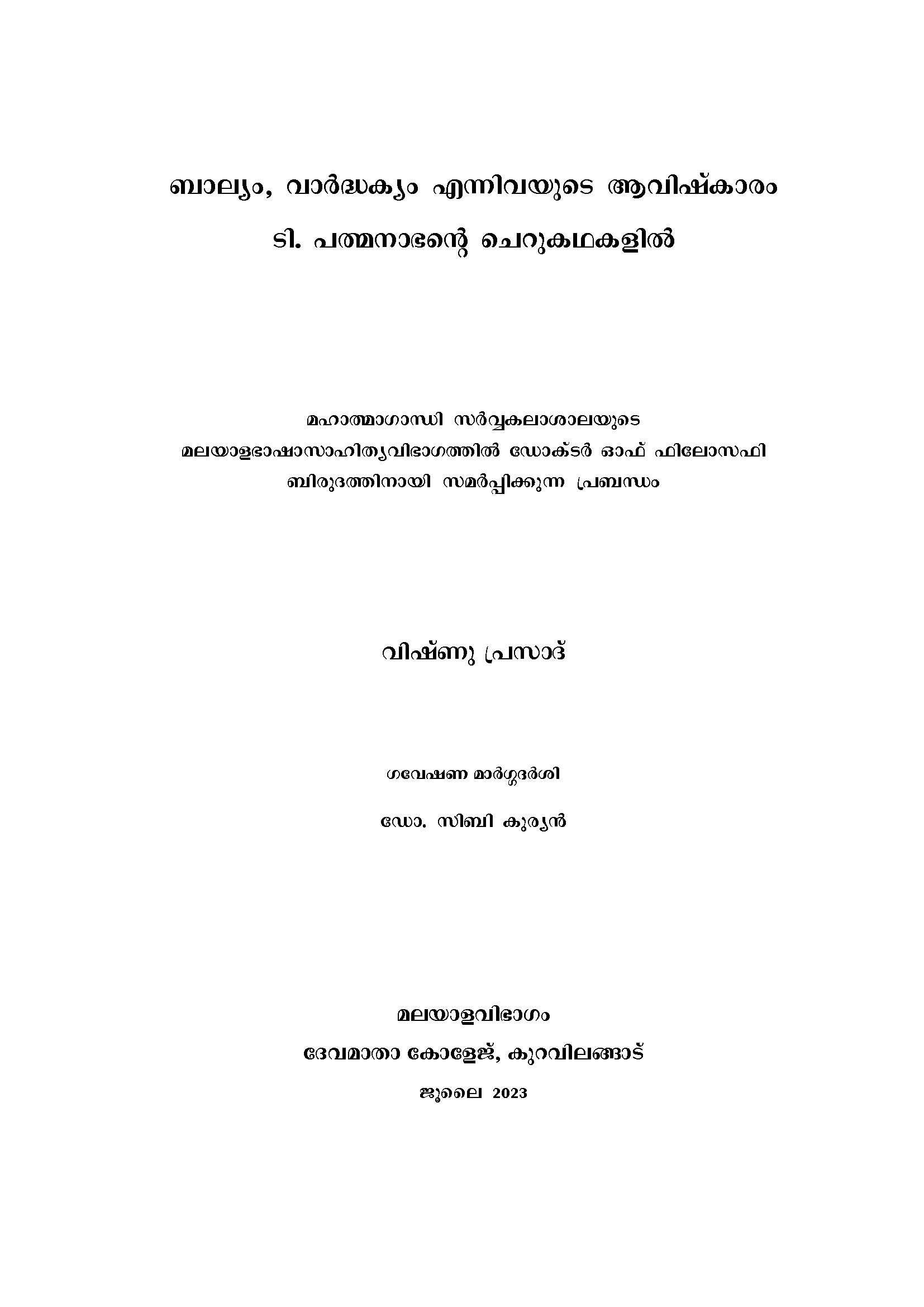 Balyam, vardhakhyam ennivayude avishkaram T Padmanabhante cherukathakalil ബാല്യം , വാർദ്ധക്യം എന്നിവയുടെ ആവിഷ്കാരം T പത്മനാഭൻറെ ചെറുകഥകളിൽ