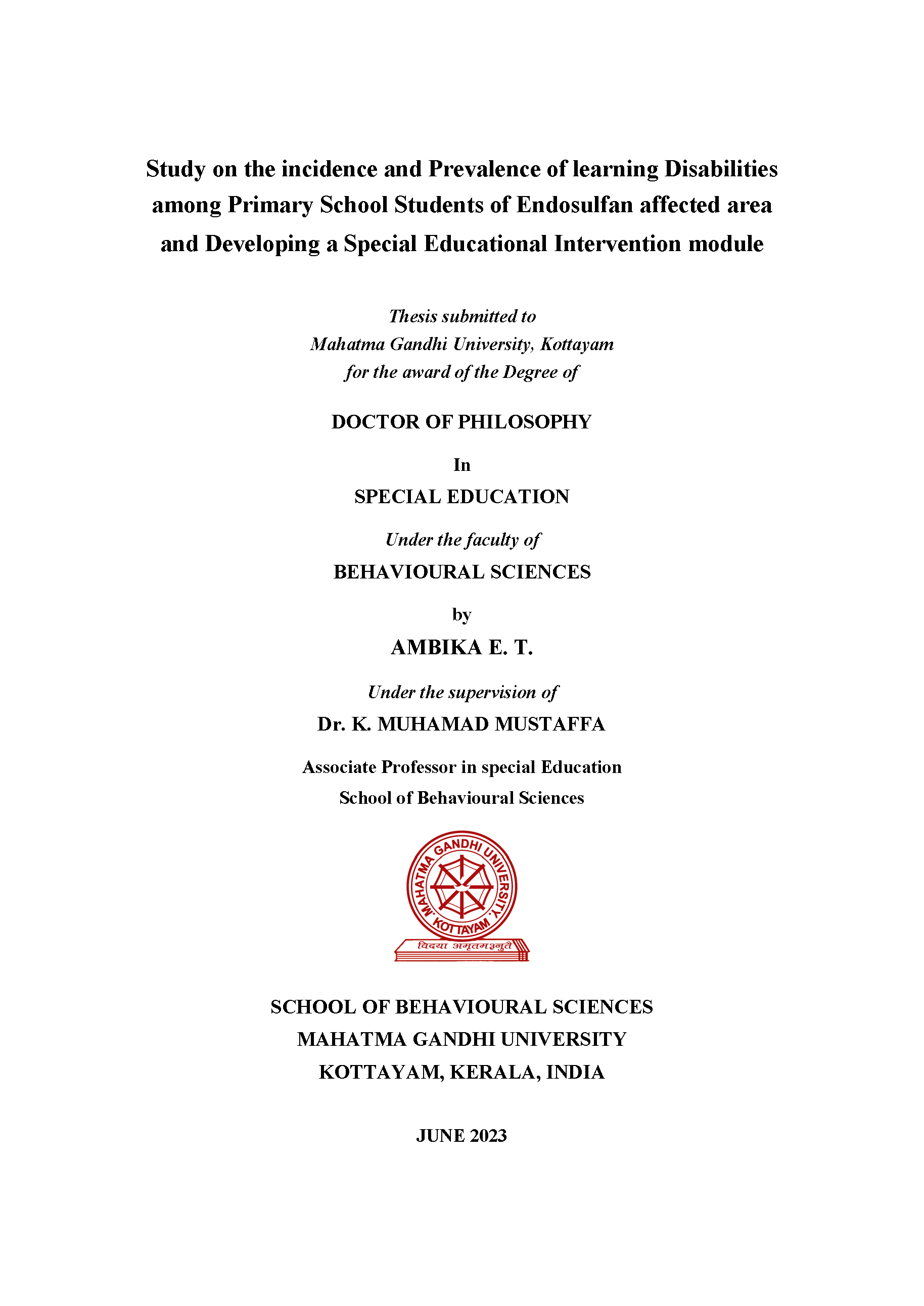Study on the incidence and Prevalence of learning Disabilities among Primary School Students of Endosulfan affected area and Developing a Special Educational Intervention module